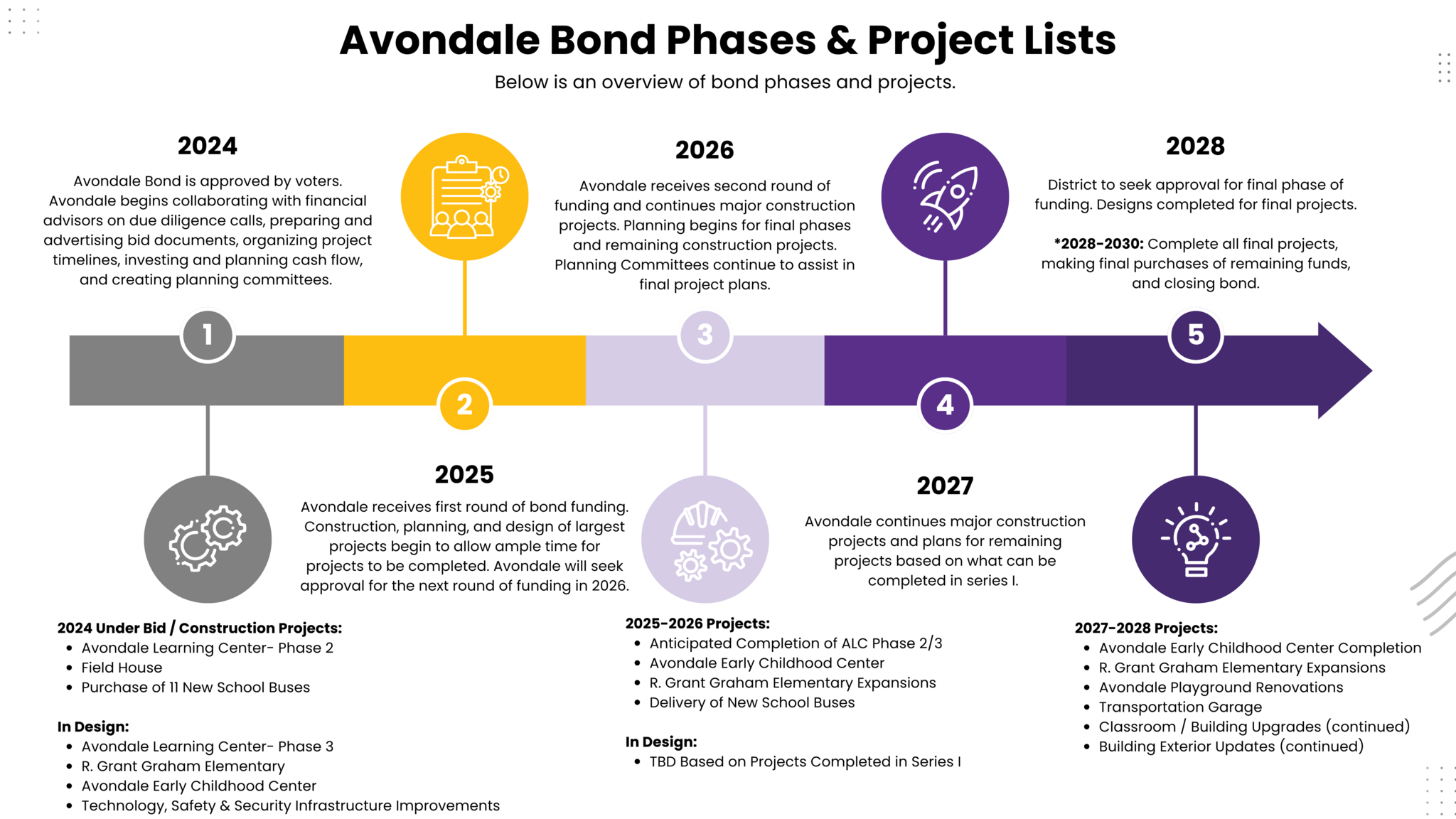 Avondale School District officials are sharing information about the bond proposal through community meetings, direct mailings, social media, the school district website, and the news media. To view a complete list of bond projects and learn more about the bond proposal, view the summary of projects section on this page.