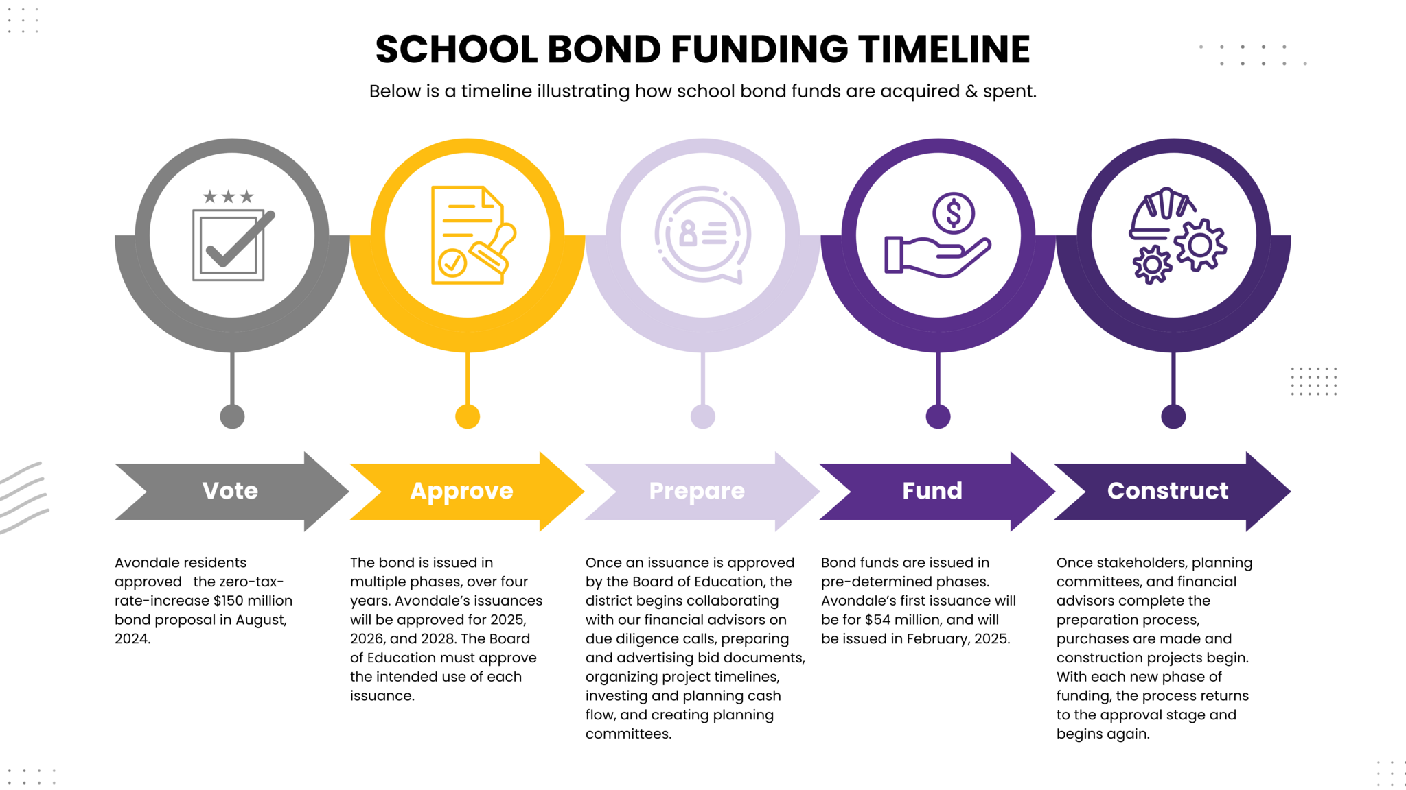 Avondale School District is pleased to announce that the Board of Education has officially approved the first round of funding from the 2024 Bond. The initial issuance of $54 million, part of the total approved amount of $150 million, is scheduled for release in February 2025. Over the course of the bond, the district will receive three distributions of funds through bond sales, 2025, 2026 and 2028.