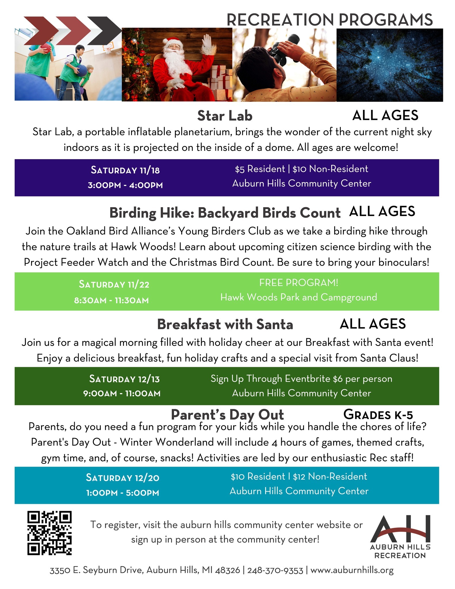 - 11/22 : Birding Hike Backyard Birds Count, 8:30am-11:30am