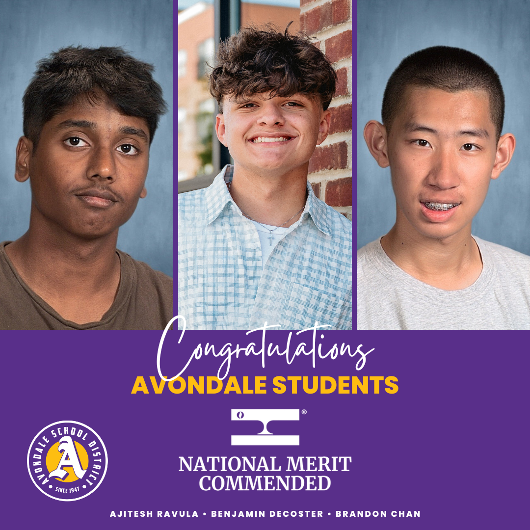 Avondale High School is proud to celebrate seniors Brandon Chan, Benjamin Decoster, and Ajitesh Ravula for earning national recognition as Commended Students in the 2026 National Merit Scholarship Program. This distinction places them among the top 50,000 students in the nation who demonstrated exceptional academic ability on the 2024 Preliminary SAT/National Merit Scholarship Qualifying Test (PSAT/NMSQT).